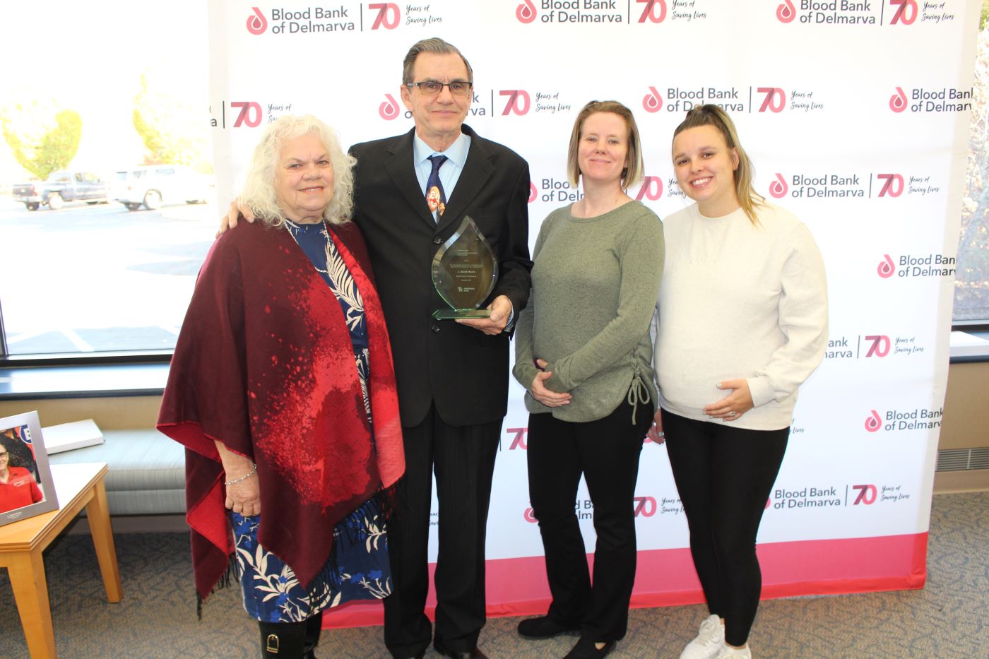 “Also, Dave’s dear mother, Louise Myers, was instrumental in organizing one of the first donor groups back in 1954 when her daughter (Dave’s sister) needed transfusions. This was in the early days of what was then the Blood Bank of Delaware, during our very first year of our operations. In a word, he’s BBD royalty.”