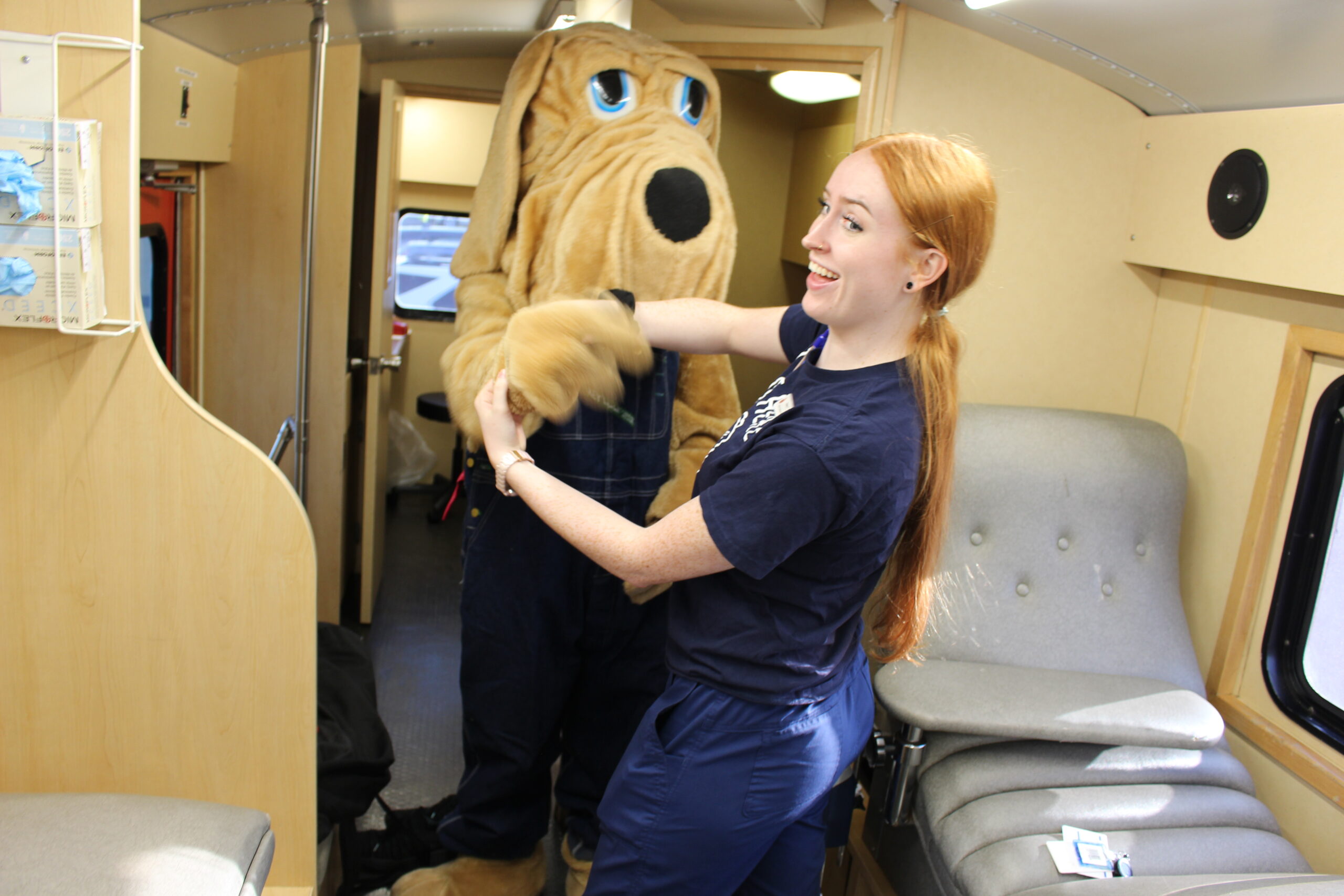 Director, Human Resources Steve Corse told Blood Collection Techs Julia Seichepine and Daisy Tannen that he would produce a good surprise, a prize if you will, for them if they made or surpassed goal. Julia and Daisy along with Supervisor, Collections Gilroy Jack and Bloodmobile Driver Ty McCall did just that as seven donors came in, with one deferral. Delmar the Bloodhound – BBD’s beloved mascot – joined us as well.