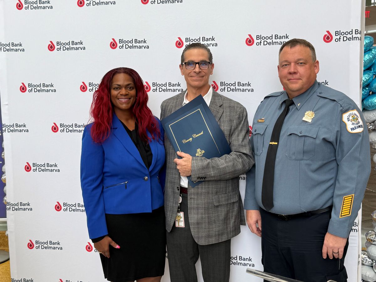 New Castle County Council President Monique Williams-Johns presented the resolution locally recognizing National Blood Donor Month, noting “the need for a diverse blood supply is constant, but the supply is not” and that “New Castle County Paramedics have partnered with Blood Bank of Delmarva for the last two years to transfuse pre-hospital, low titer O-positive whole blood at the scene of accidents and traumas in an effort to save more lives.”