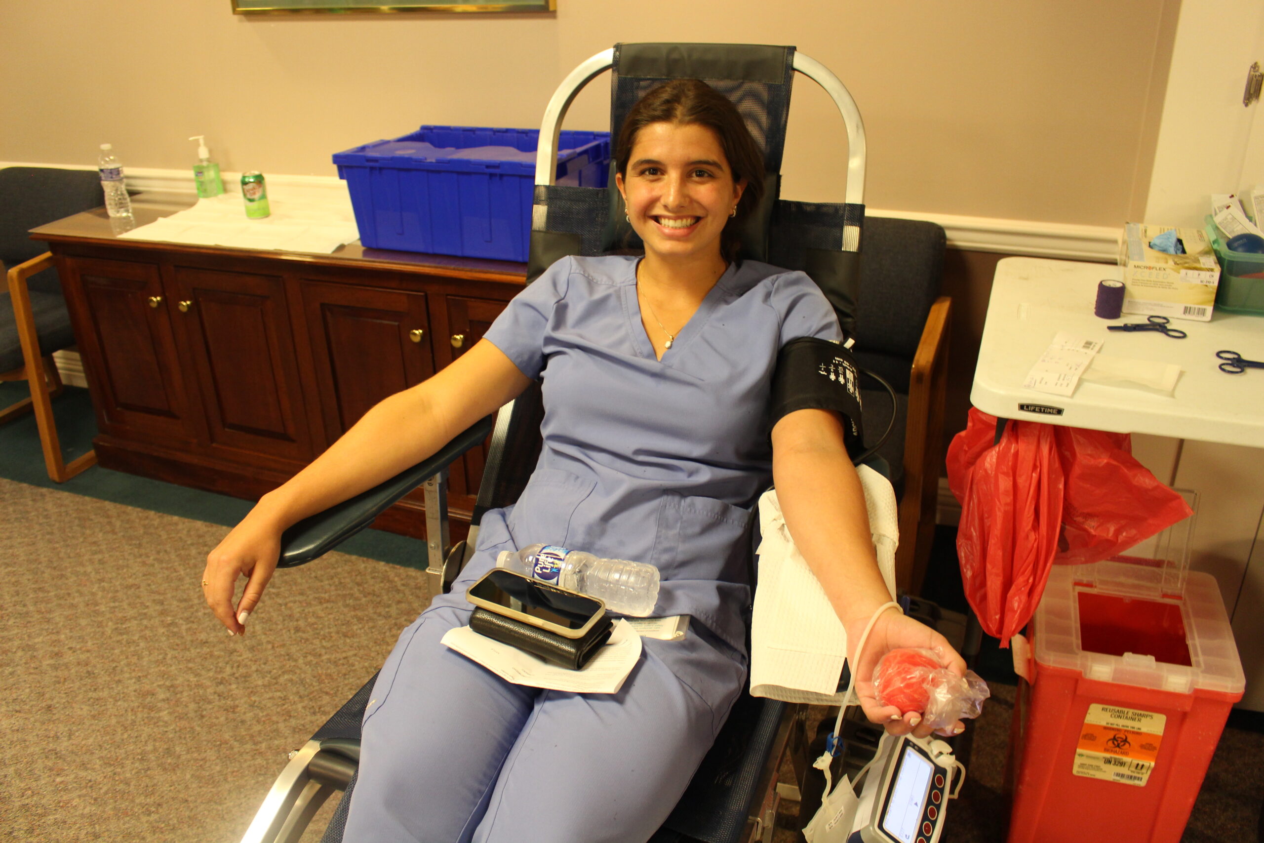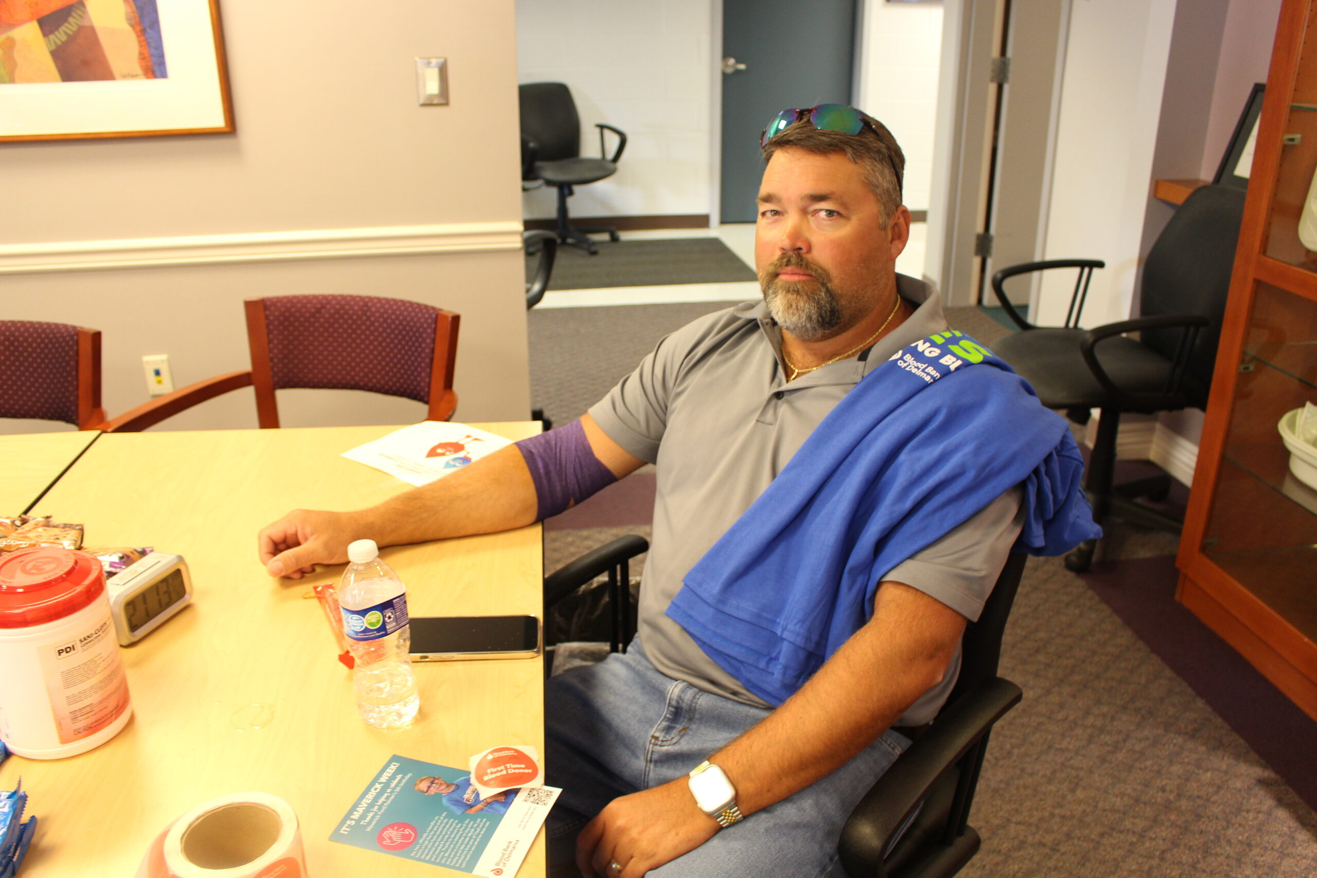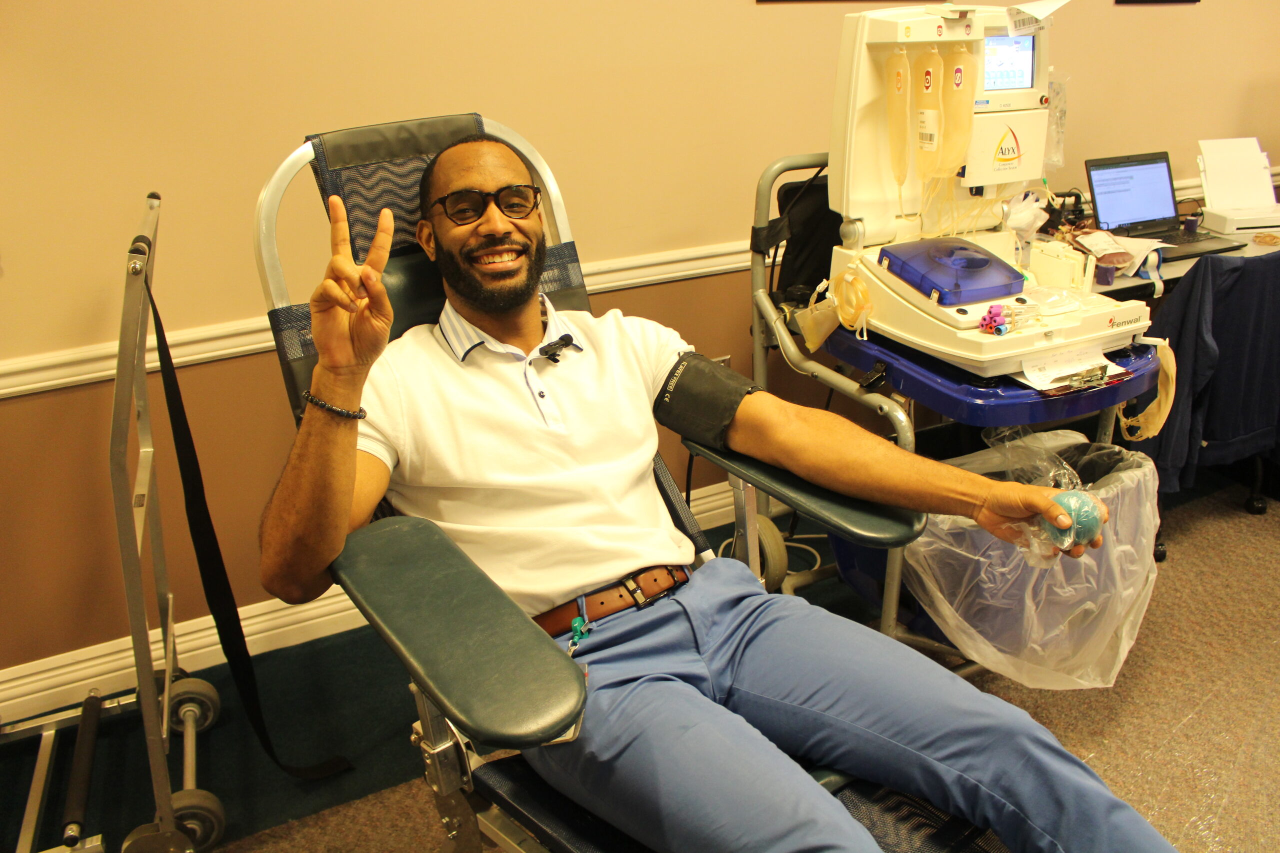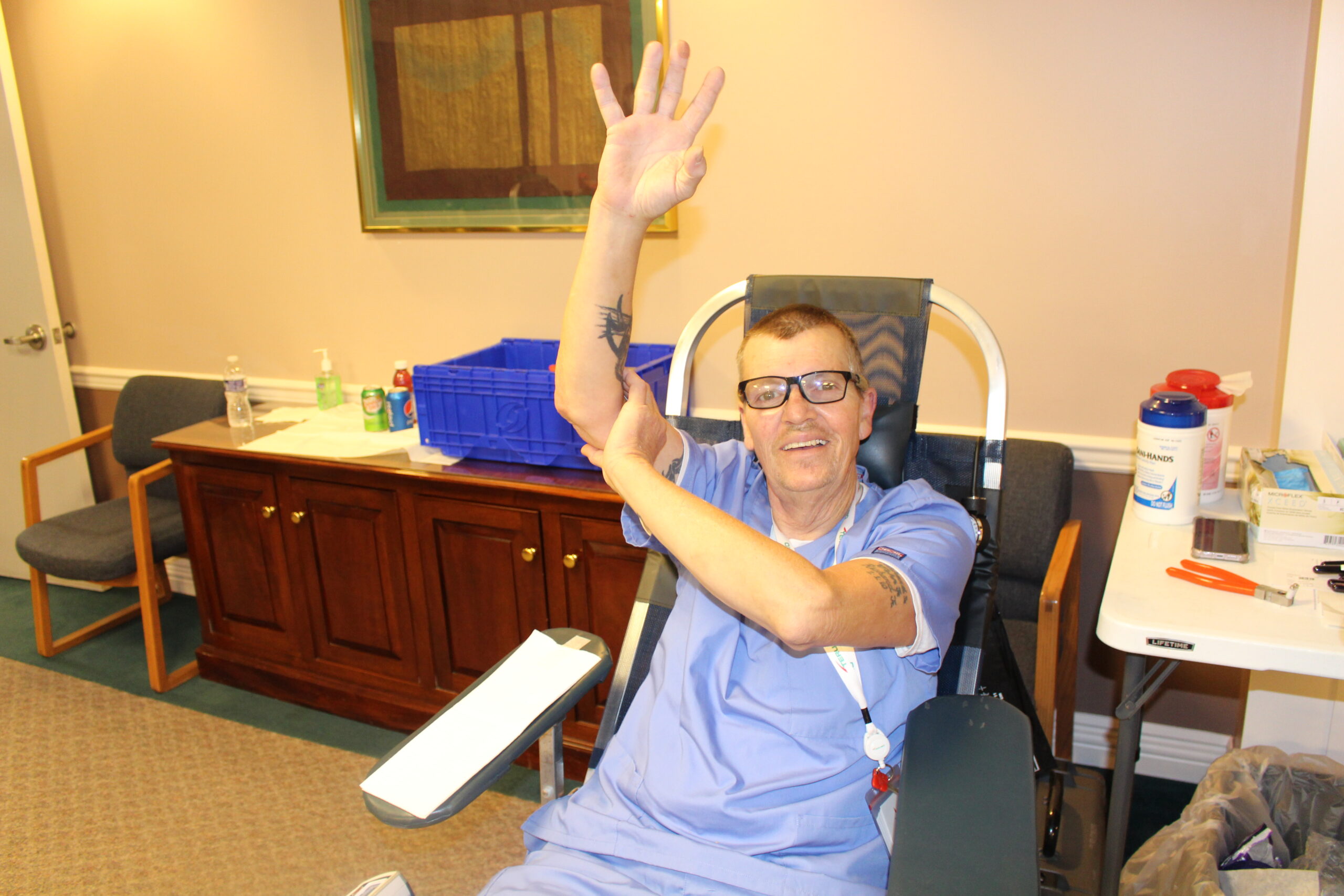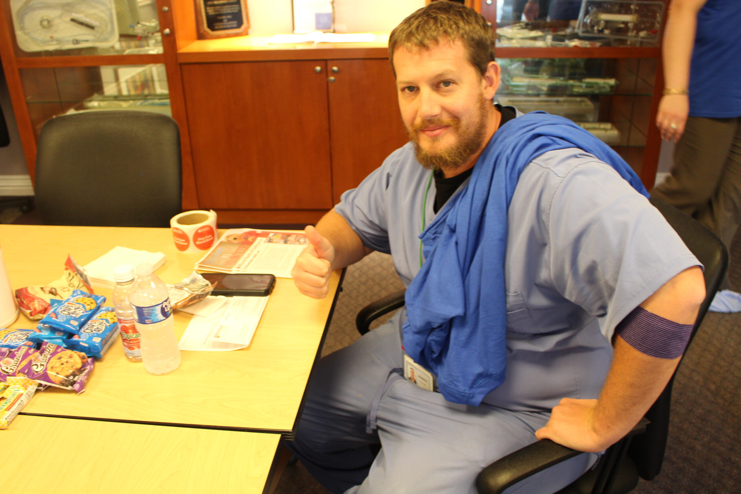 Stephanie was particularly pleased that as of 11:15 a.m., Evan was the seventh double red cell donor, and she was slated to be the ninth in the afternoon. That’s significant because whereas a whole blood donation yields one unit of red cells, double reds yield two units. There were no double red cell appointments when this blood drive started.
