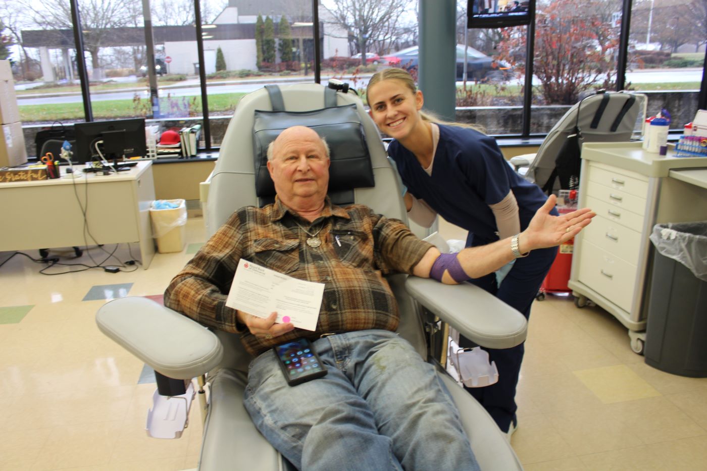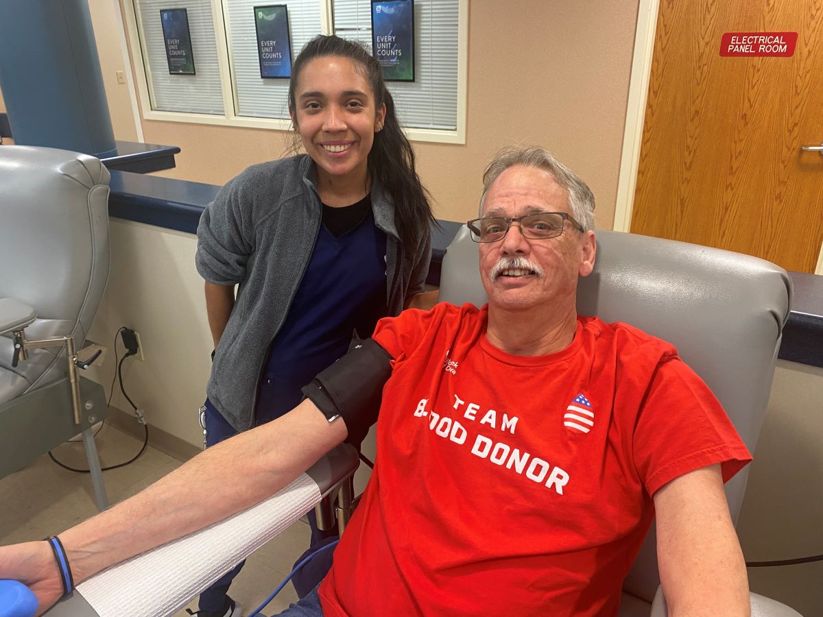 Tom Maiura also knows it’s important to donate regularly because of his O negative blood type. He donates in memory of his late father. He is a member of the Galloneer Club (two gallons) thanks to his regular donations, including during the holidays.